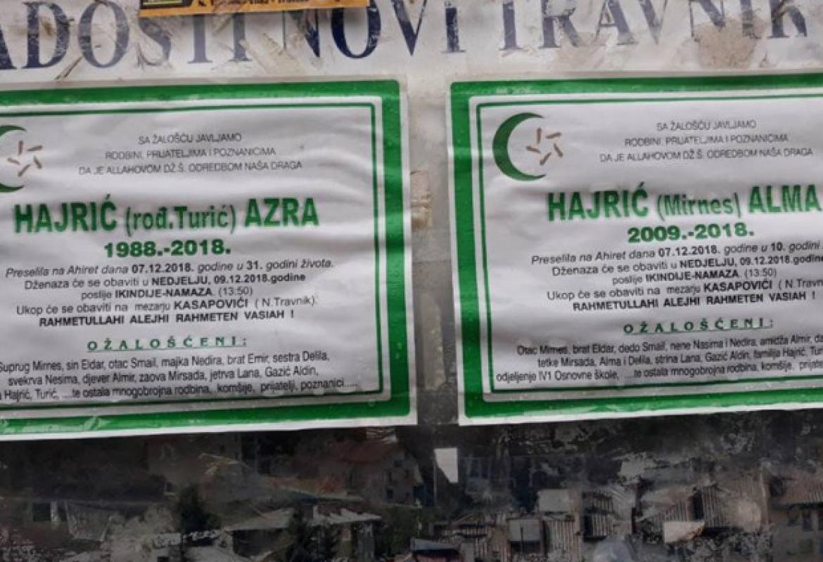 Za danas je zakazana dženaza tragično nastradalima Azri Hajrić i njenoj kćerki Almi. Dženaza će biti obavljena poslije ikindije-namaza (13.50 sati) u selu Kasapovići kod Novog Travnika. I danas je u Novom Travniku dan žalosti.