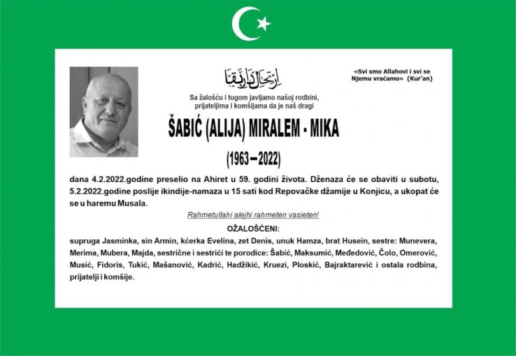 Danas će biti klanjana dženaza heroju Miralemu Miki Šabićuu 15 kod Repovačke džamije u Konjicu. Mika će biti ukopan u haremu Musala.