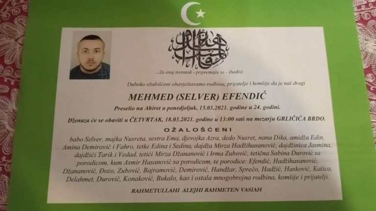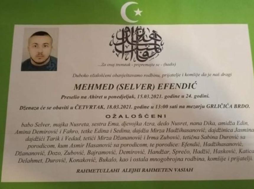 Mehmed Meša Efendić, koji je u Sarajevu juče izgubio bitku za život, bit će ukopan u četvrtak, 18. marta 2021. godine u 13 sati na mezarju Grličića Brdo.