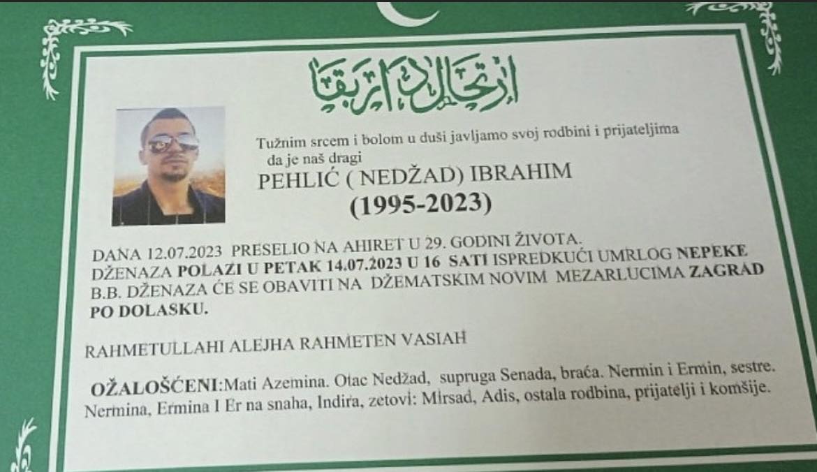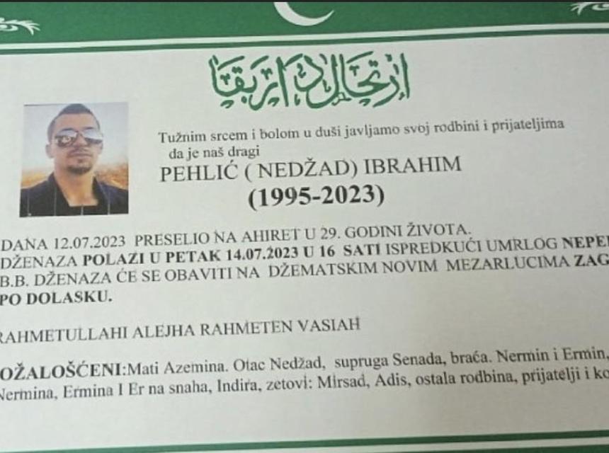 Dženaza tragično preminulom Pehlić Ibrahimu iz Velike Kladuše polazi u petak 14. jula u 16 sati ispred kuće umrlog Nepeke bb, a obavit će se na novim džematskim mezarlucima Zagrad po dolasku.
