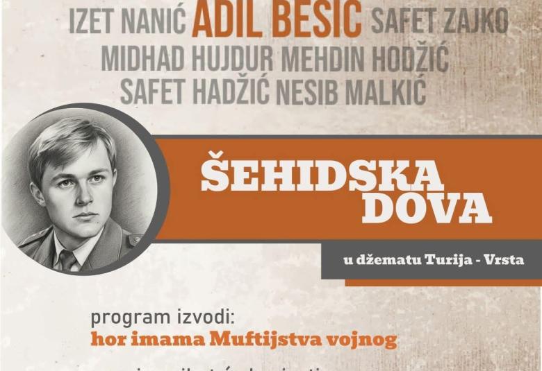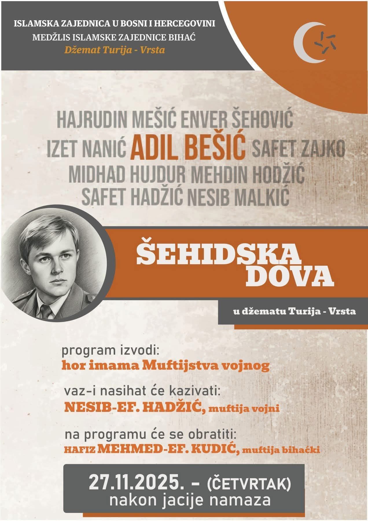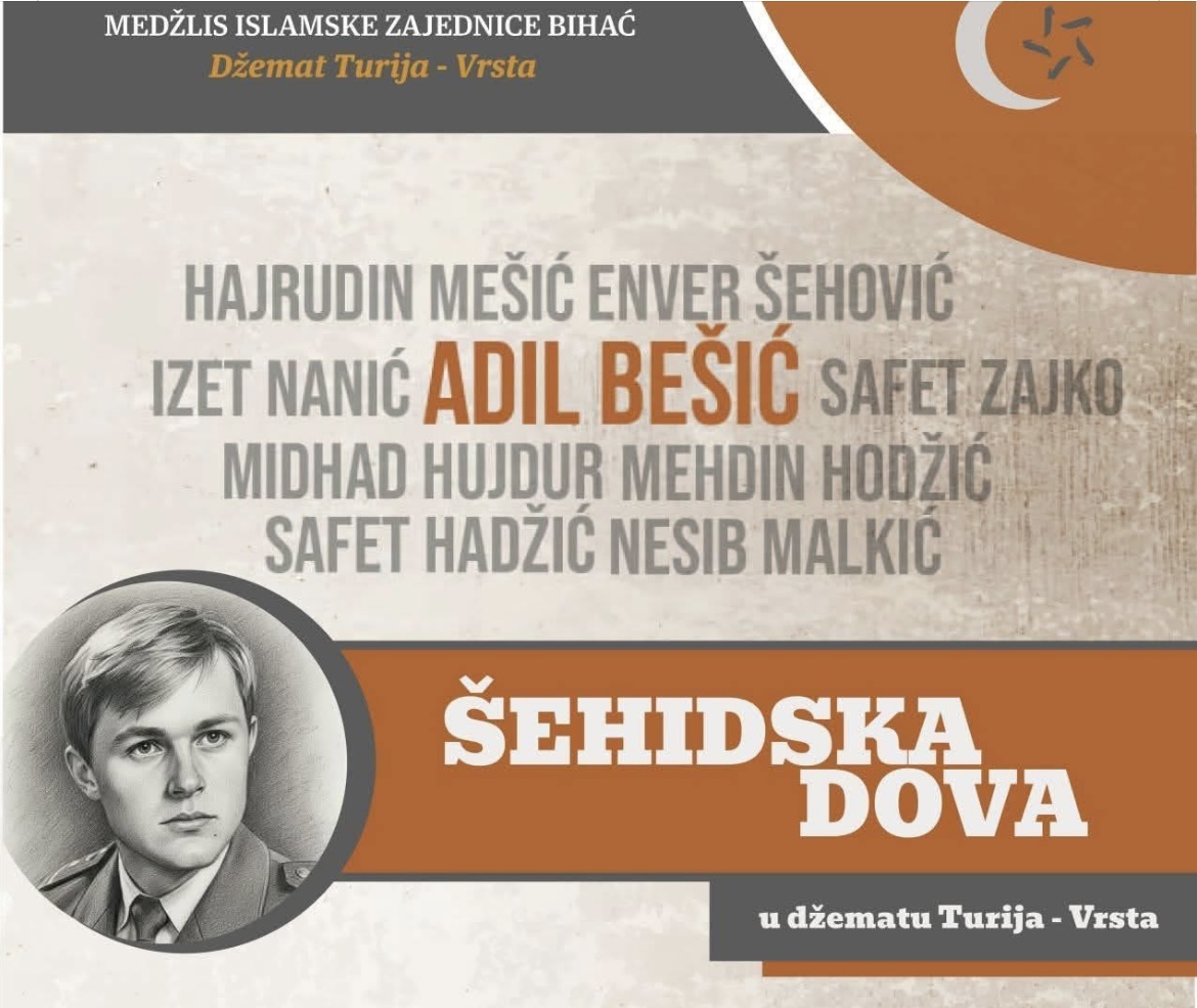 Danas, 27. novembra 2025. godine, u džematu Turija–Vrsta kod Bihaća bit će obilježena godišnjica pogibije majora Adila Bešića, jednog od najistaknutijih heroja odbrambeno–oslobodilačkog rata u Bosni i Hercegovini. Tim povodom, proučit će se tradicionalna Šehidska dova, koju ovaj džemat svake godine organizira u znak sjećanja na hrabre sinove domovine.