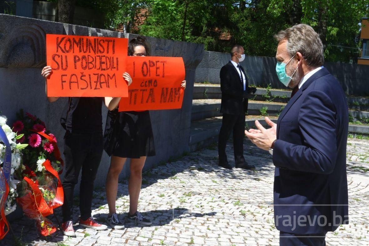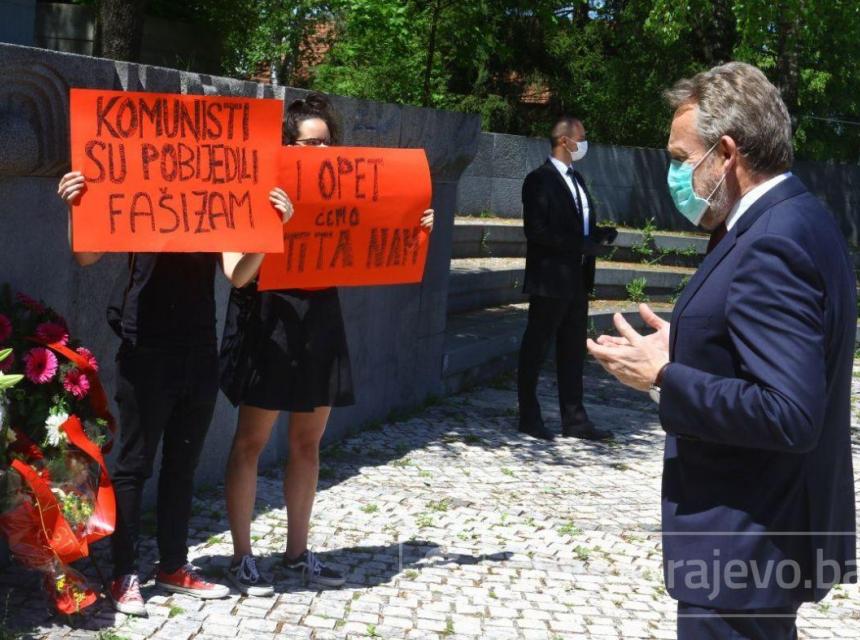Delegaciju su dočekale dvije djevojke noseći transparente na kojima je pisalo: "Komunisti su pobijedili fašizam i opet ćemo Tita nam".