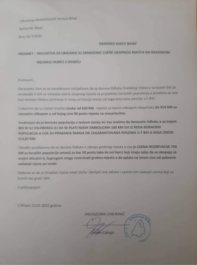 Bihać 14 Jul, 2022 - 08:18 / Uredio: Emma O. / Comments Demobilisani borci Bihać: Inicijativa za smanjenje cijene ukopnog mjesta na mezarju Humci u Bihaću demobilisani borci smanjenje cijena mezarje Humci Related Articles Bihać KRAJINA Sun, 28 Dec 2025 - 20:44 Održana 5. Bihaćka novogodišnja petica: Gutić i Faber odbranili titule pobjednika Bihać KRAJINA Sat, 27 Dec 2025 - 20:35 Privremena regulacija saobraćaja u Bihaću zbog ‘Pete bihaćke novogodišnje petice’ Bihać KRAJINA Thu, 25 Dec 2025 - 08:17 Na tribini Pezića u Bihaću skupljeno skoro 13 hiljada KM za pomoć Zinaidi Šekić Bihać KRAJINA Thu, 25 Dec 2025 - 08:12 Bihać ulazi u 2026. s jasnim planom i velikim projektima Bihać KRAJINA Thu, 25 Dec 2025 - 07:16 Maja Džafić: Nastavnica za poželjeti Bihać Bosanska Krupa Bosanski Petrovac Bužim CAZIN KRAJINA Wed, 24 Dec 2025 - 08:45 Krajina bez struje - evo kad i evo gdje