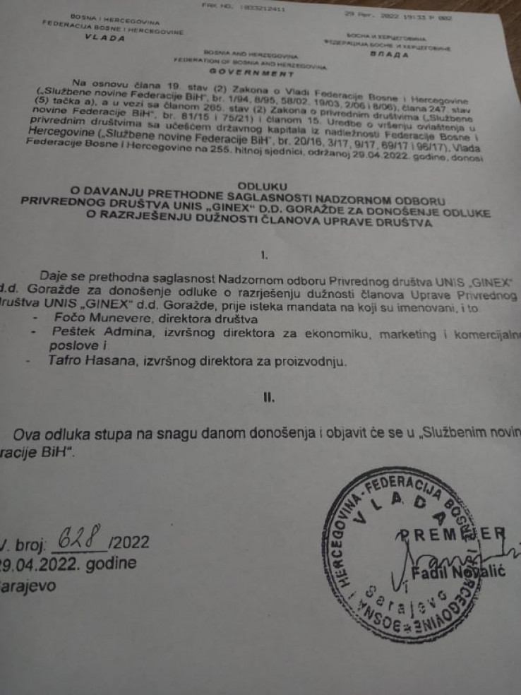 Vlada Federacije BiH je danas na hitnoj, telefonski održanoj sjednici, donijela odluku kojom daje prethodnu saglasnost Nadzornom odboru privrednog društva UNIS ,"GINEX" d.d. Goražde za donošenje odluke o razrješenju dužnosti članova Uprave ovog privrednog društva, prije isteka mandata na koji su imenovani, i to direktora društva Munevere Fočo, izvršnog direktora za ekonomiku, marketing i komercijalne poslove Admina Pešteka i izvršnog direktora za proizvodnju Hasana Tafre, saopćeno je iz Vlade FBiH.