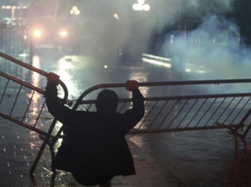 Zatim je Baša poveo pristalice prema zgradi parlamenta, na koji je mala grupa ljudi kamufliranih lica bacala dimne bombe i petarde.