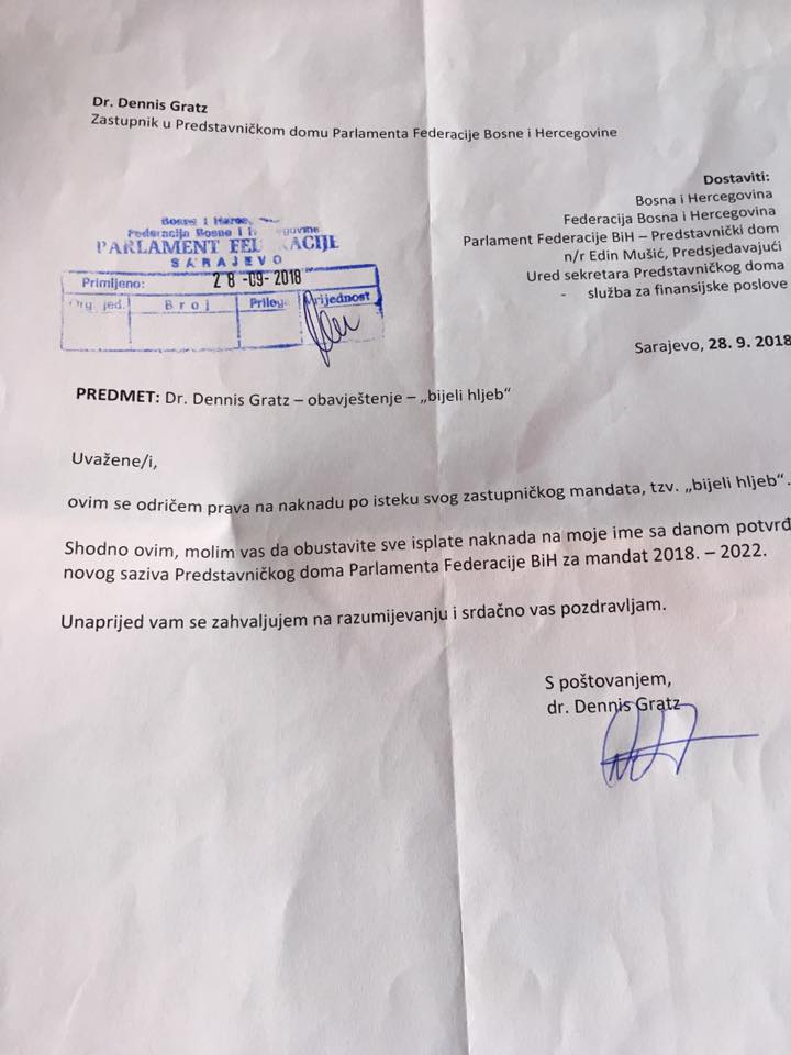 Unaprijed vam se zahvaljujem na razumijevanju i srdačno vas pozdravljam." Dennis Gratz.