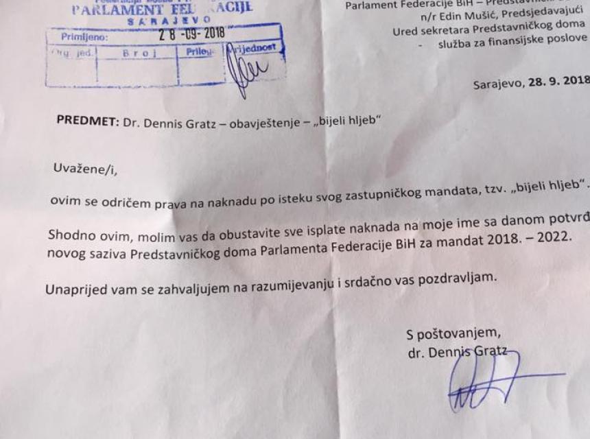 "Uvažene/i, ovim se odričem se prava na naknadu po isteku svog zastupničkog mandata, tzv. "Bijeli hljeb".