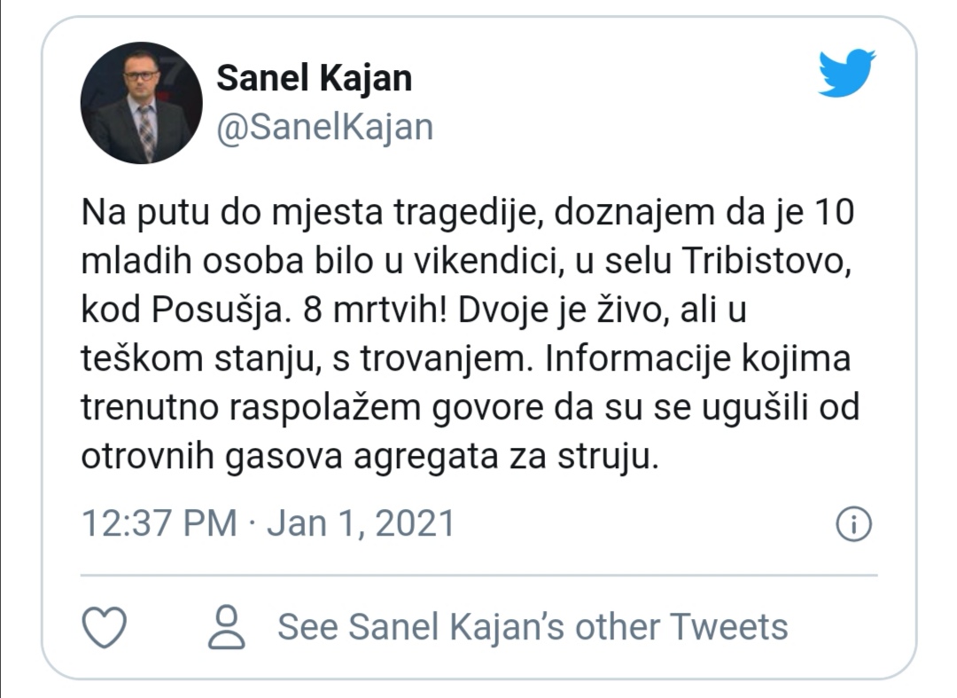 Prema trenutno dostupnim informacijama, smrt osam mladih lica nastala je uslijed gušenja otrovnim gasovima agregata za struju.