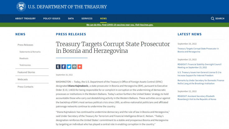 Ured za kontrolu strane imovine američkog Ministarstva trezora (OFAC) danas je Dianu Kajmaković, državnu tužiteljicu Tužilaštva BIH, na osnovu Izvršnog naloga (E.O.) 14033 stavio na crnu listu.