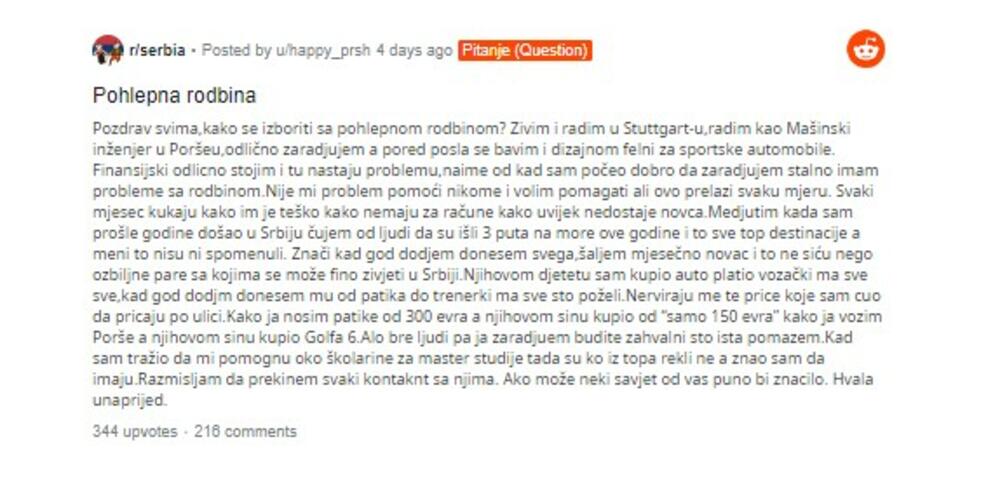 Znači kad god dođem donesem svega, šaljem mjesečno novac i to ne siću nego ozbiljne pare sa kojima se može fino živjeti u Srbiji. Njihovom djetetu sam kupio auto, platio vozački ma sve sve, kad god dođem donesem mu od patika do trenerki ma sve što poželi. Nerviraju me te priče koje sam čuo da pričaju po ulici. Kako ja nosim patike od 300 eura, a njihovom sinu kupio od ‘samo 150 eura’, kako ja vozim Porsche, a njihovom sinu kupio Golfa 6. Alo bre ljudi pa ja zarađujem budite zahvalni što išta pomažem. Kad sam tražio da mi pomognu oko školarine za master studije tada su ko iz topa rekli ne, a znao sam da imaju. Razmišljam da prekinem svaki kontakt sa njima. Ako može neki savjet od vas puno bi značilo. Hvala unaprijed – stajalo je u njegovoj objavi.