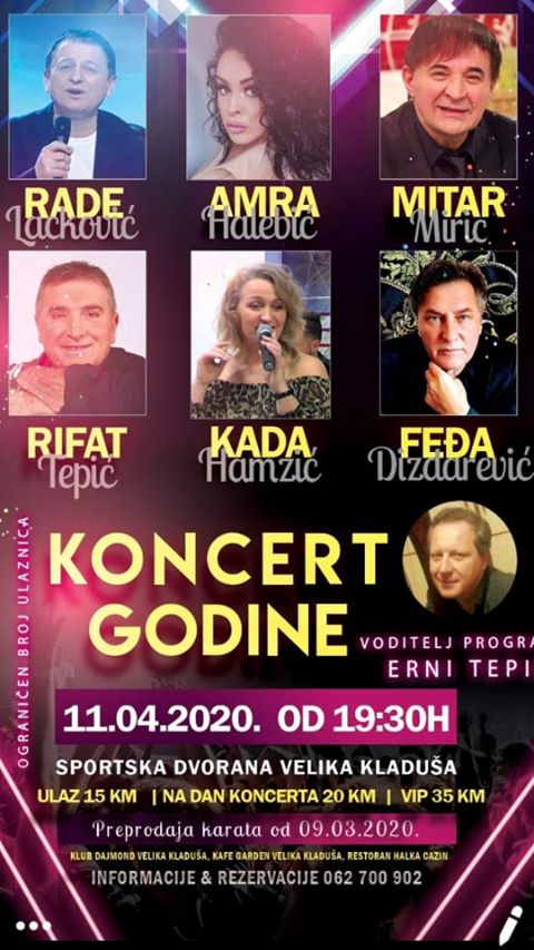 Preprodaja karata počinje od 09.03.2020.godine, možete ih pronaći u Klubu Diamond Velika KLaduša, Kafe Garden Velika Kladuša i Restoran Halka Cazin.