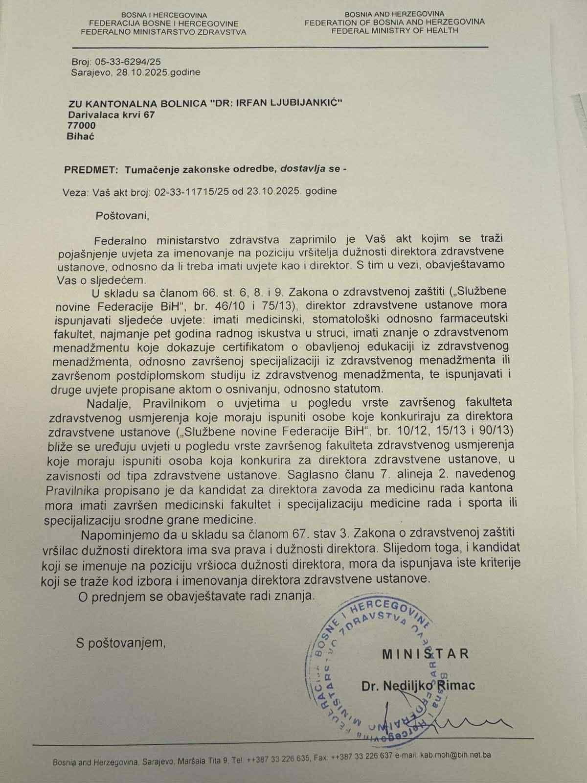 Iako je federalni ministar zdravstva ranije jasno upozorio da privremeni direktor mora ispunjavati zakonske uslove, Upravni odbor je odlučio postupiti suprotno propisima.