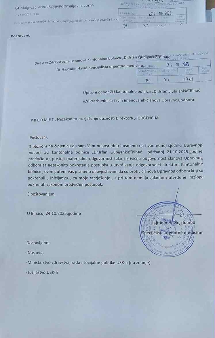 Novi skandal potresa Unsko-sanski kanton – direktor bihaćke bolnice razriješen je prije isteka mandata, a protiv članova Upravnog odbora i Skupštine USK podnio je krivične prijave zbog nezakonite smjene, trgovine uticajem i koruptivnih radnji.
