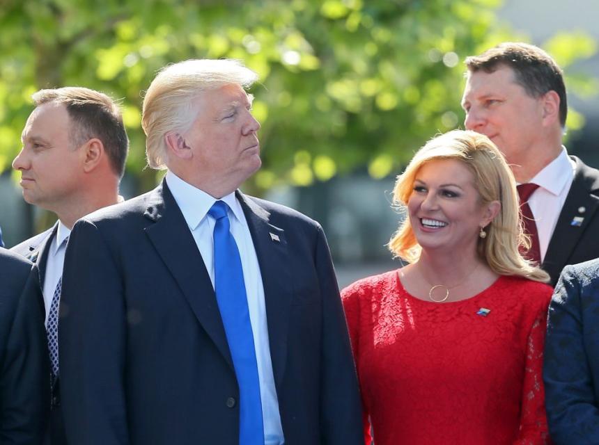 Da je za takav odnos hrvatska predsjednica znatno zagrijanija nego Trump, potvrđuju snimci Brisela, koji prikazuju njeno uporno nastojanje da po svaku cijenu stane uz prvog čovjeka SAD prilikom poziranja za zajedničku fotografiju. Na kojoj njih dvoje, mora se priznati, izgledaju poput Kena i Barbie u nešto zrelijim godinama.