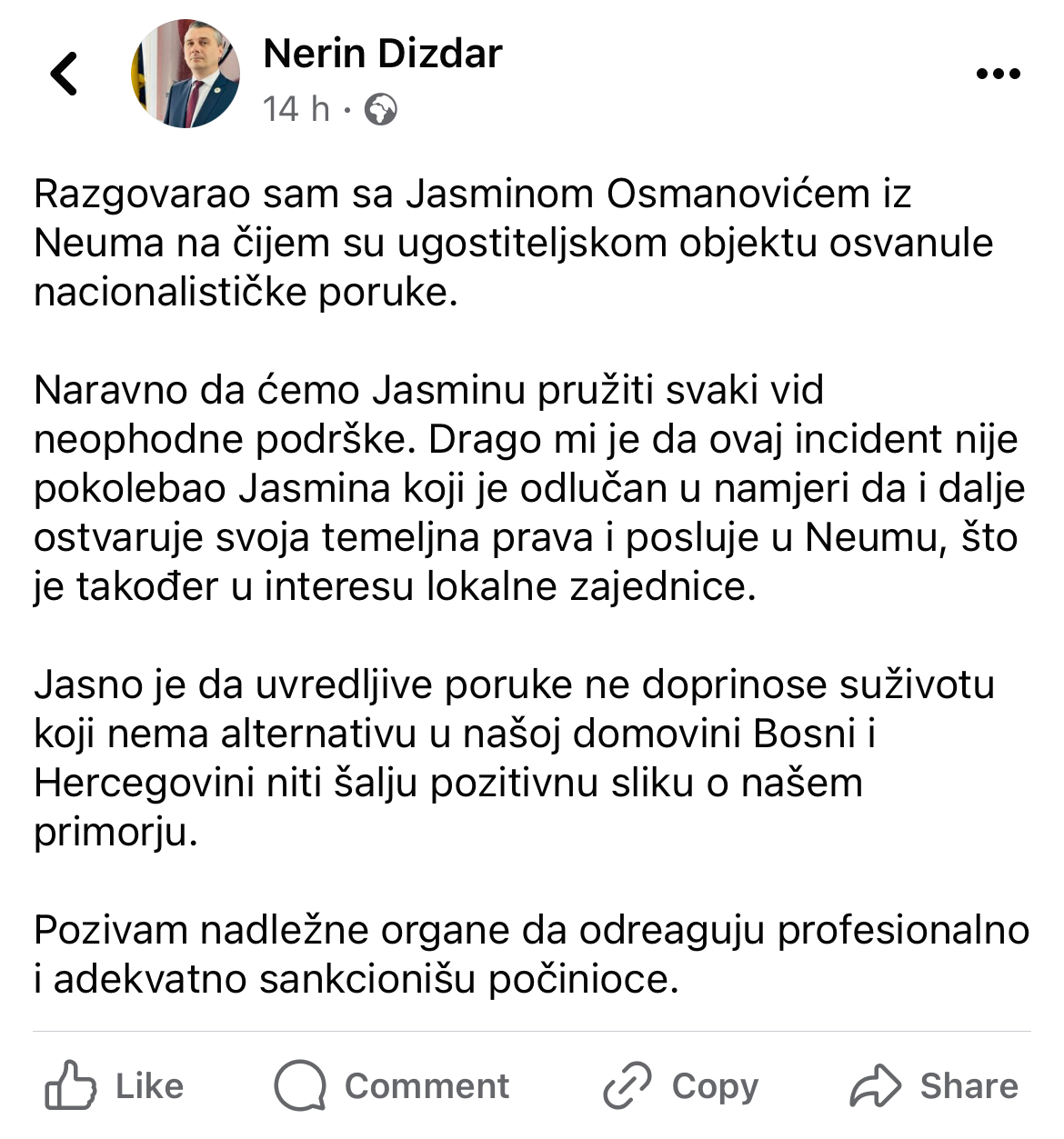 Federalni ministar raseljenih osoba i izbjeglica Nerin Dizdar razgovarao je sa Jasminom Osmanovićem iz Neuma na čijem su ugostiteljskom objektu osvanule nacionalističke poruke.