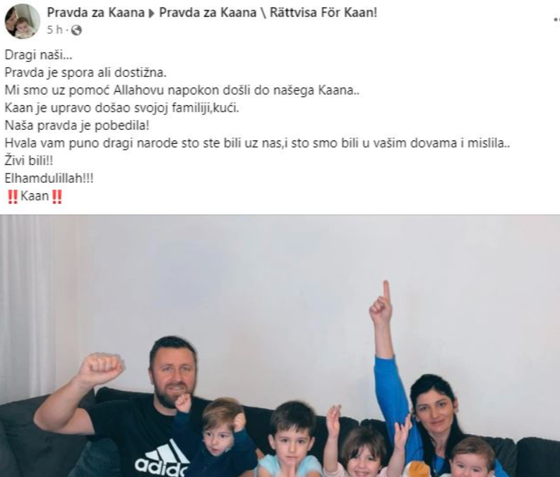 “Dragi naši, pravda je spora ali dostizna. Mi smo uz pomoć Allahovu napokon došli do našega kaana Kaan je upravo došao svojoj familiji kući. Naša pravda je pobedila! Hvala vam puno dragi narode sto ste bili uz nas i sto smo bili u vašim dovama i mislila. Živi bili!!”, objavili su na društvenim mrežama roditelji, porijeklom iz Cazina, čiju tromjesečnu bebu su prije neokoliko mjeseci oduzele švedske socijalne službe.