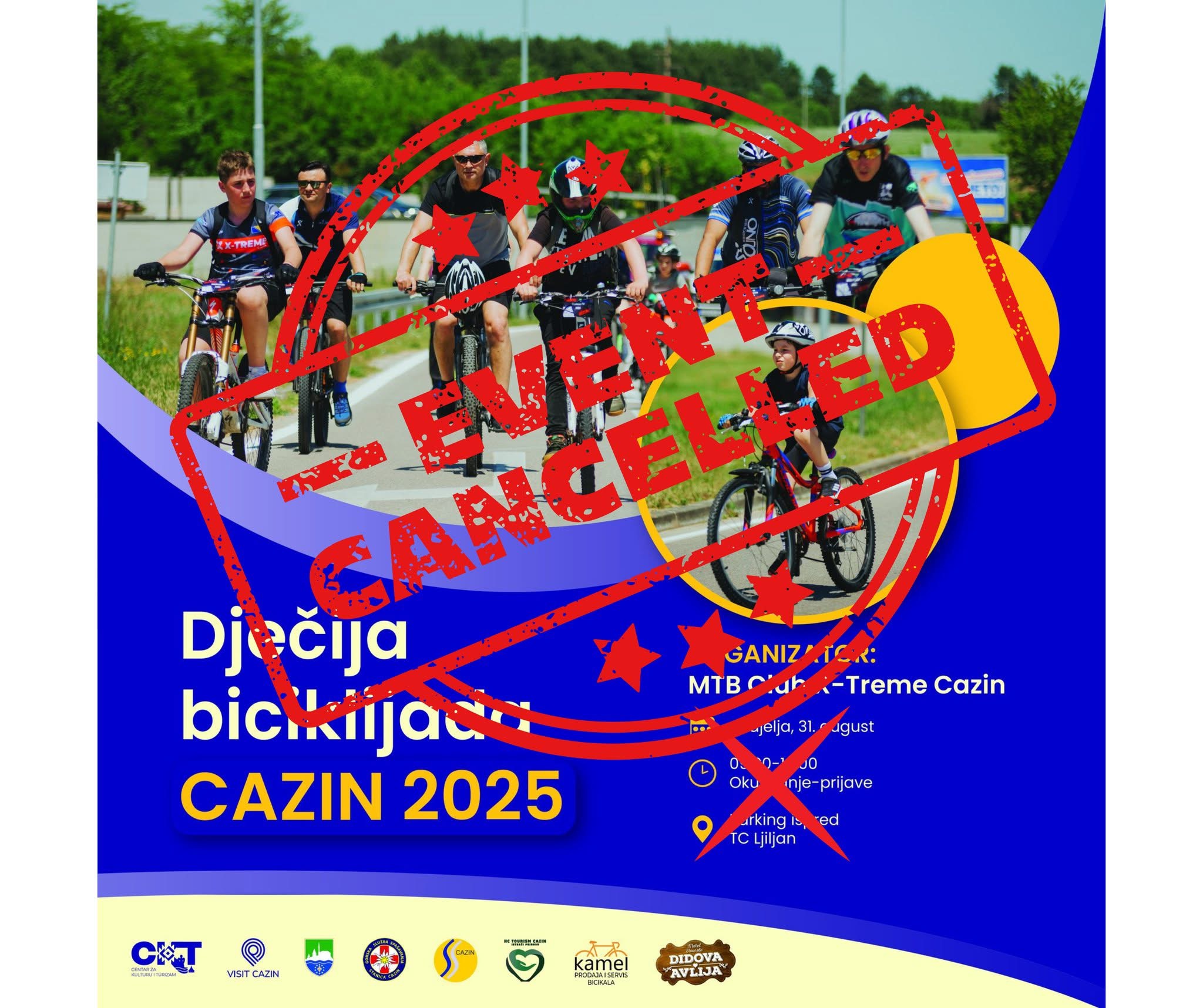 MTB Club X-Treme Cazin obavijestio je javnost da se ovogodišnja Dječija biciklijada Cazin 2025, planirana za nedjelju, 31. august, neće održati zbog nepovoljnih vremenskih prilika.