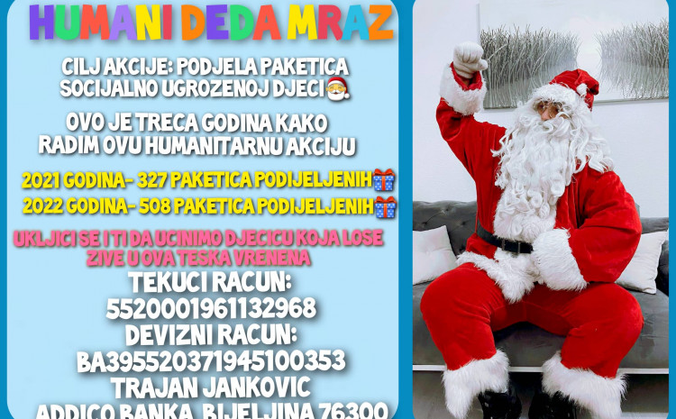 U 2021. godini u Bijeljini je podijeljeno 327 paketića, u 2022. taj broj je bio 508. Djeci koja žive u teškim uvjetima možete pomoći uplatom na tekući račun: 552 000 196 113 2968, ili devizni račun: BA 3955 2037 1945 100 353, na ime Trajan Janković, Adiko banka Bijeljina 76300. Također možete nazvati broj 065 050 036 za bilo kakve dodatne informacije.