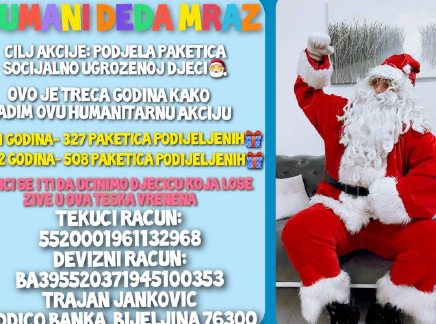 Djed Mraz koji dolazi na kućnu adresu i svake godine obraduje mališane je Trajan Janković, mladić koji je u Bijeljini postao veoma poznato lice kada je riječ o humanosti. Trajan kaže da je akcija pokrenuta ove godine malo ranije zbog krize u svijetu.