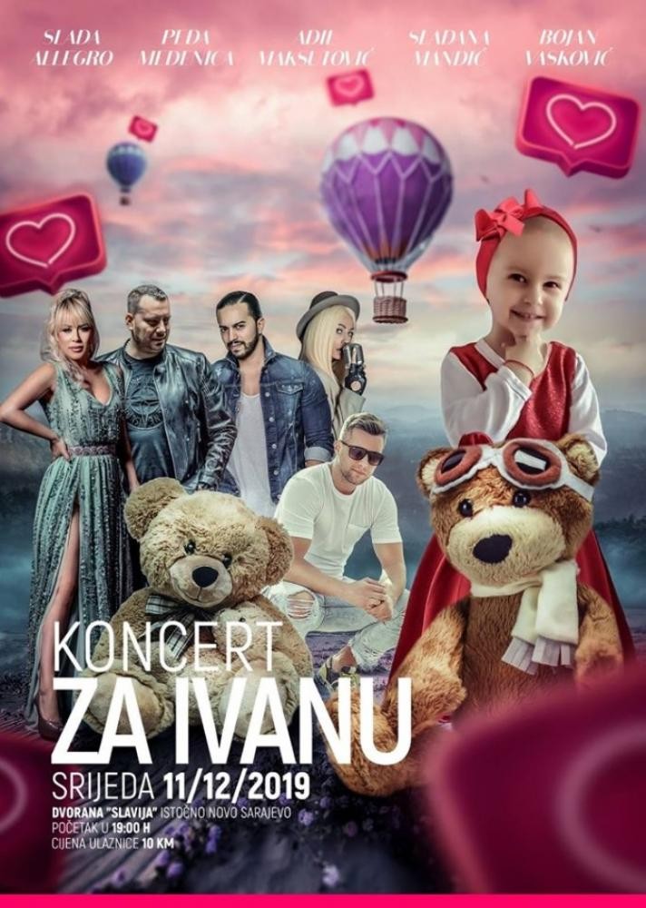 Bolest djevojčice Ivane Bjelogrlić tako je ujedinila pjevače iz BiH i Srbije, koji će u srijedu, 11.12.2019. godine, sa početkom u 19:00 sati u dvorani „Slavija“ u Istočnom Sarajevu održati humanitarni koncert.