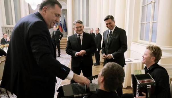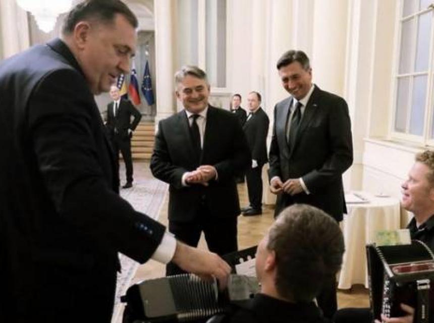 SNSD je na Twitter profilu objavio fotografiju su predsjedavajući i član Predsjedništva BiH Željko Komšić i Milorad Dodik, te u predsjednik Slovenije u društvu dvojice harmonikaša.