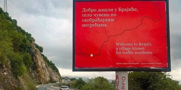 ”Dobro došli u Brajiće, selo čuveno po saobraćajnim nesrećama. Welcome to Brajići, a vilage known for traffic accidents”, piše na bilbordu. Bilbord je potpisan od strane Mjesne zajednice Brajići.