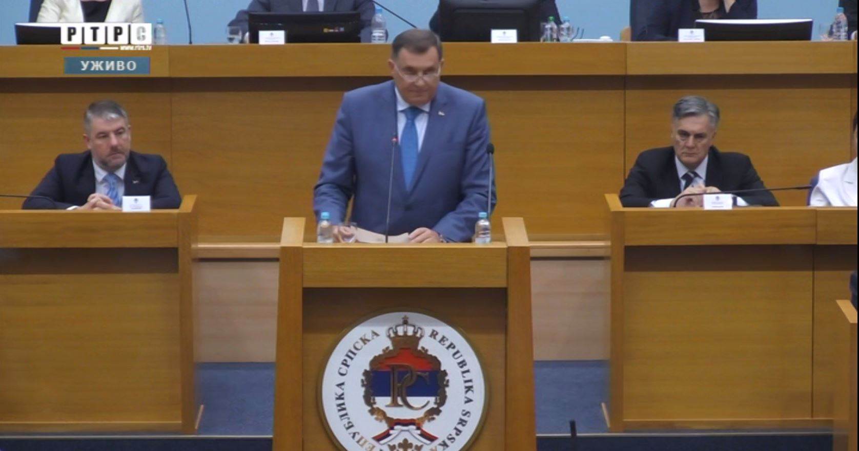 U uvodnom dijelu svog obraćanja poslaniccima u NSRS, Dodik je naveo da je ovo je"posebna sjednica NSRS i treba je posmatrati kao afirmaciju prava koje NSRS ima". Kako je naveo, mjesto odluka o važnim pitanjima nijsu institucije Bosne i Hercegovine već Narodna skupština RS kao što je danas slučaj.