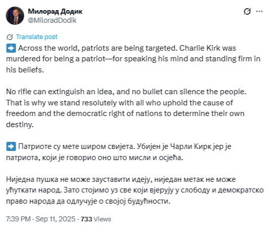 - Ubijen je Čarli Kirk jer je patriota, koji je govorio ono što misli i osjeća. Nijedna puška ne može zaustaviti ideju, nijedan metak ne može ušutkati narod. Zato stojimo uz sve koji vjeruju u slobodu i demokratsko pravo naroda da odlučuje o svojoj budućnosti - napisao je Dodik na društvenoj mreži X.