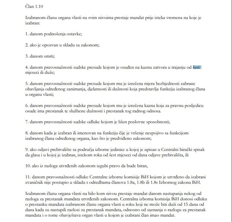 Član 1.10.4 Izbornog zakona BiH kaže da "izabranom članu organa vlasti na svim nivoima prestaje mandat prije isteka vremena na koje je izabran danom pravosnažnosti sudske presude kojom je osuđen na kaznu zatvora u trajanju od šest mjeseci ili duže".