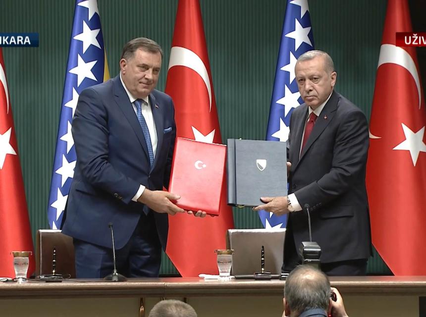 "Ovdje smo došli sa velikim očekivanjima u vezi sa Sporazumom o slobodnoj trgovini i zadovoljstvo mi je veliko da sam sa predsjedikom Erdoganom potpisao odredbe toga sporazuma. Dakle, naši odnosi su ojačani i danas smo također potpisali prvi formalni dogovor o izgradnji puta Sarajevo-Begrad", kazao je Dodik i dodao:
