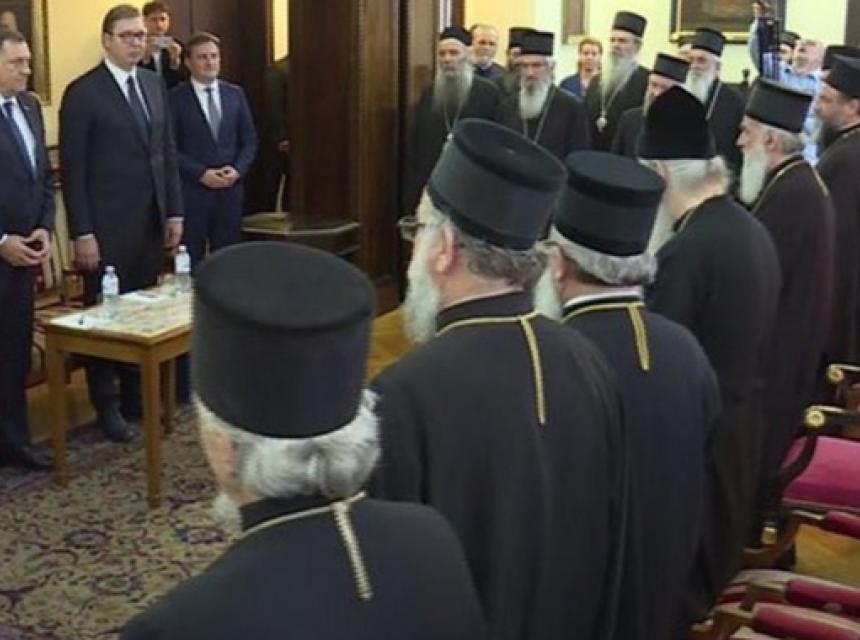 Vučić je poručio da će nastaviti da se bori kako bi se izvuklo maksimalno za srpski narod na Kosovu, ali da neće pristajati na bilo kakve ucjene i zahvalio patrijarhu, episkopima i Dodiku.