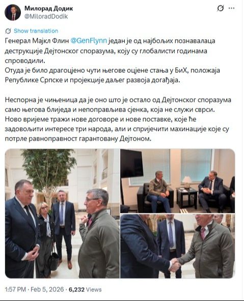 - General Majkl Flin jedan je od najboljih poznavalaca destrukcije Dejtonskog sporazuma, koju su globalisti godinama sprovodili. Otuda je bilo dragocjeno čuti njegove ocjene stanja u BiH, položaja Republike Srpske i projekcije daljeg razvoja događaja. Nesporna je činjenica da je ono što je ostalo od Dejtonskog sporazuma samo njegova blijeda i nepopravljiva sjenka, koja ne služi svrsi – poručio je Dodik.