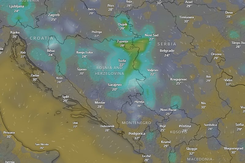 Danas će širom zemlje preovladavati sunčano vrijeme uz umjerenu oblačnost. Poslije podne, na istoku i jugu, mogući su kratkotrajni lokalni pljuskovi, no to neće pokvariti opći dojam ljetnog dana. Dnevna temperatura kretat će se između 30 i 36 stepeni.