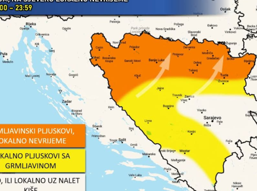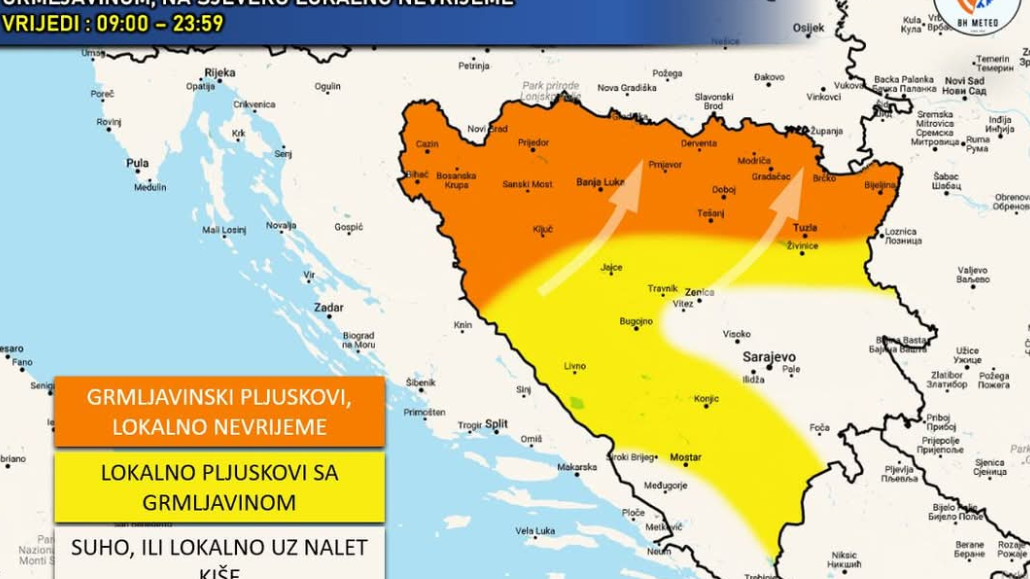Danas(05.05.) u nastavku dana nestabilno vrijeme širom zemlje. Najviše nestabilnosti, odnosno padavina na sjeverozapadu, sjeveru, sjeveroistoku Bosne uz povremeno kišu i lokalne pljuskove sa grmljavinom. U navedenim dijelovima zemlje moguće je i nevrijeme.