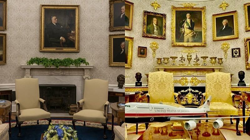 Tramp je po povratku u Bijelu kuću odlučio Ovalni ured urediti u skladu sa svojim ukusom za glamur i raskoš. Plavi Bajdonov tepih zamijenio je Reganovim svjetlijim tepihom sa sunčevim zrakama i simbolom mira. Zidove je pretvorio u galeriju dodajući nove portrete i masivne, dekorativne okvire od zlata. Na mjesto Ruzveltovog portreta postavljen je Džordž Vašington, a kamini su ukrašeni zlatnim urnama i dekorativnim predmetima iz kolekcije Bijele kuće.