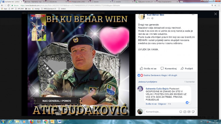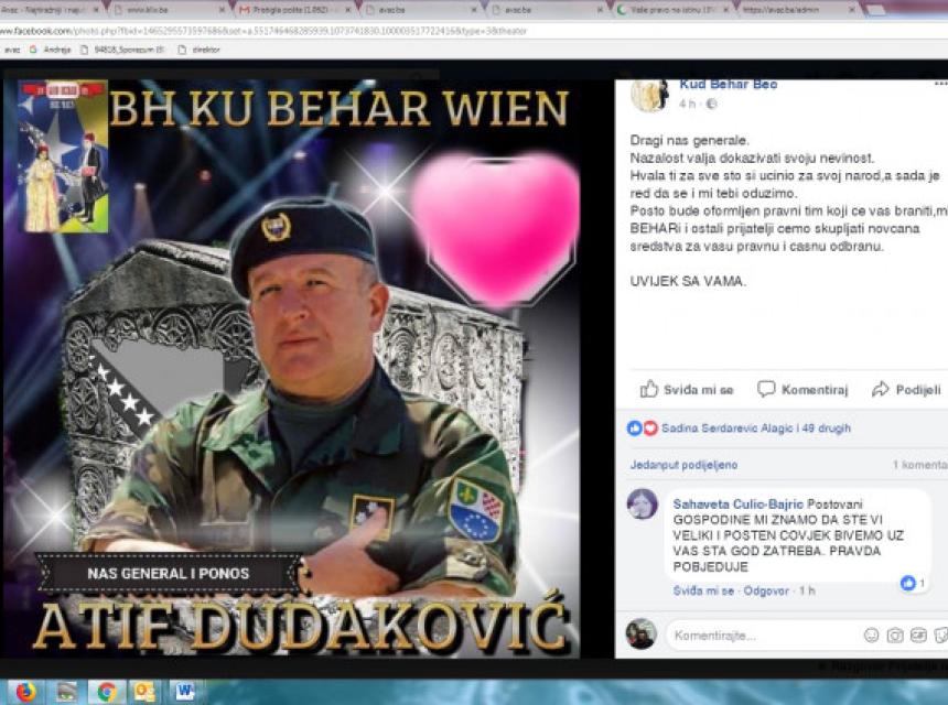 - Dragi naš generale, nažalost, valja dokazivati svoju nevinost. Hvala ti za sve što si učinio za svoj narod, a sada je red da se i mi tebi odužimo. Pošto bude oformljen pravni tim koji će vas braniti, mi u „Beharu“ i ostali prijatelji skupljat ćemo novčana sredstva za vašu pravnu i časnu odbranu - navode iz tog udruženja, uz porukugeneralu Dudakoviću: „Uvijek s Vama.“