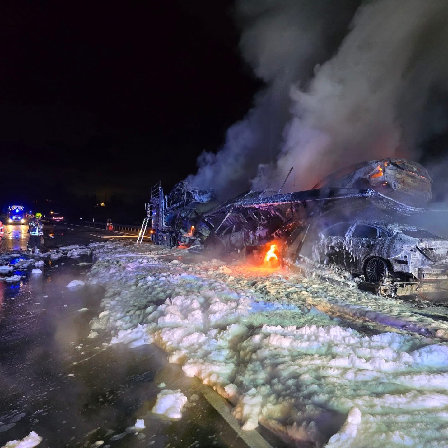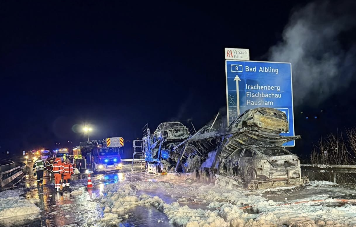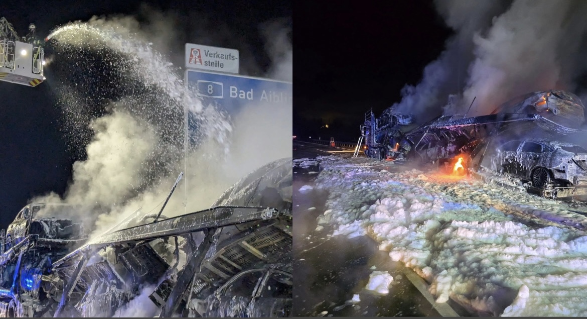 Rano jutros na njemačkoj autocesti A8, u blizini mjesta Irschenberg u Bavarskoj, došlo je do ozbiljnog incidenta koji je izazvao potpuni saobraćajni kolaps. Šleper natovaren automobilima zapalio se u vožnji i u kratkom vremenu potpuno izgorio, prenosi bild.de.