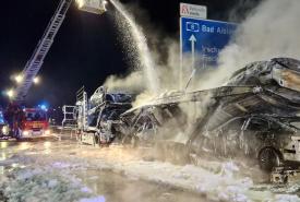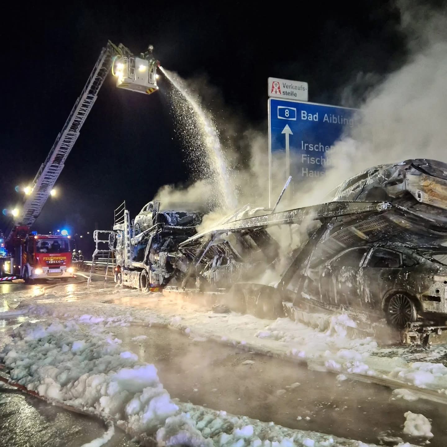 Kako navode njemački mediji, požar je izbio oko 03:40 sati, na dionici autoceste A8 u pravcu Salzburga, u blizini izlaza Irschenberg. Šleper je bio natovaren sa šest novih vozila marke Mercedes, koja su u požaru potpuno uništena.