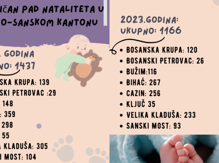 Prema podacima statističkog biltena Federalnog zavoda za statistiku, u Unsko-sanskom kantonu u 2022. godini rođeno je 1437 djece, a u 2023. 1166 djece što je pad od skoro 20%.