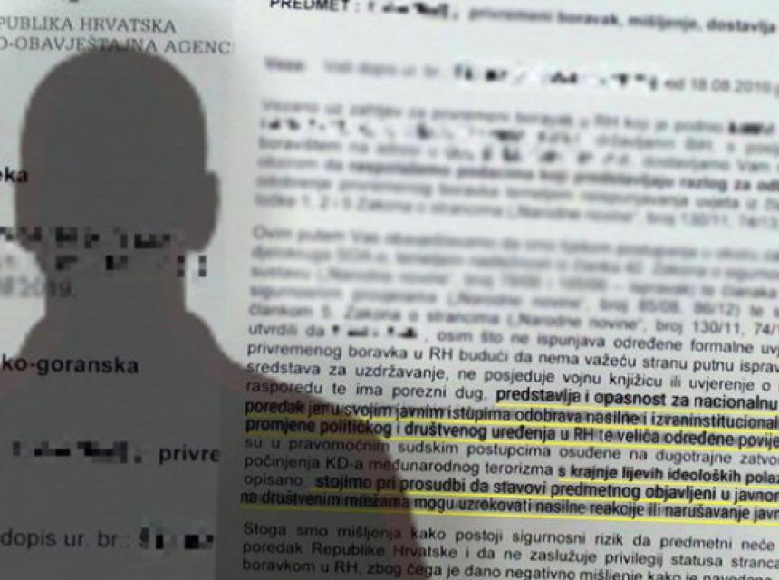 Kako je navedeno u mišljenju Sigurnosno-obavještajne agencije, kojim se ovom državljaninu BiH odbija produženje privremenog boravka u Hrvatskoj, on predstavlja opasnost za nacionalnu sigurnost i javni poredak, jer u svojim javnim istupima "odobrava nasilne i vaninstitucionalne oblike otpora i promjene političkog društvenog uređenja u Republici Hrvatskoj, te veliča određene historijske ličnosti koje su u pravomoćnim sudskim postupcima osuđene na dugotrajne zatvorske kazne zbog počinjenja krivičnih djela međunarodnog terorizma s krajnje lijevih ideoloških polazišta", prenosi Avaz.ba.