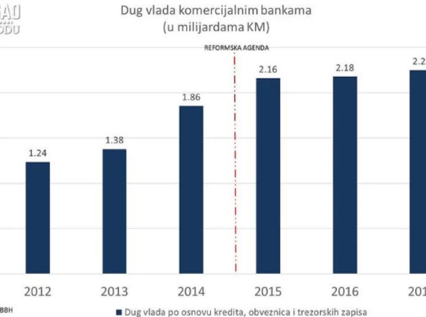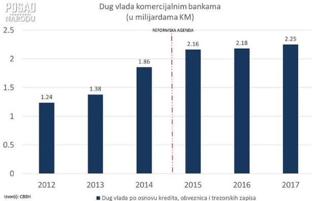Na fotografiji je prikazan šestogodišnji pregled zaduživanja vlada u BiH (prije svega vlada FBiH i RS) kod komercijalnih banaka, gdje je vidljivo da je vrijednost toga duga u 2017. bila dvije milijarde i dvije stotine pedest miliona KM, uz rapidan rast u posljednje tri godine u vrijednosti od 390 miliona KM ili 21% (!).
