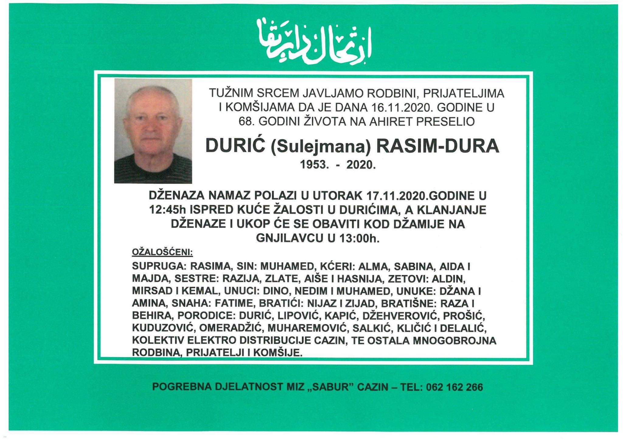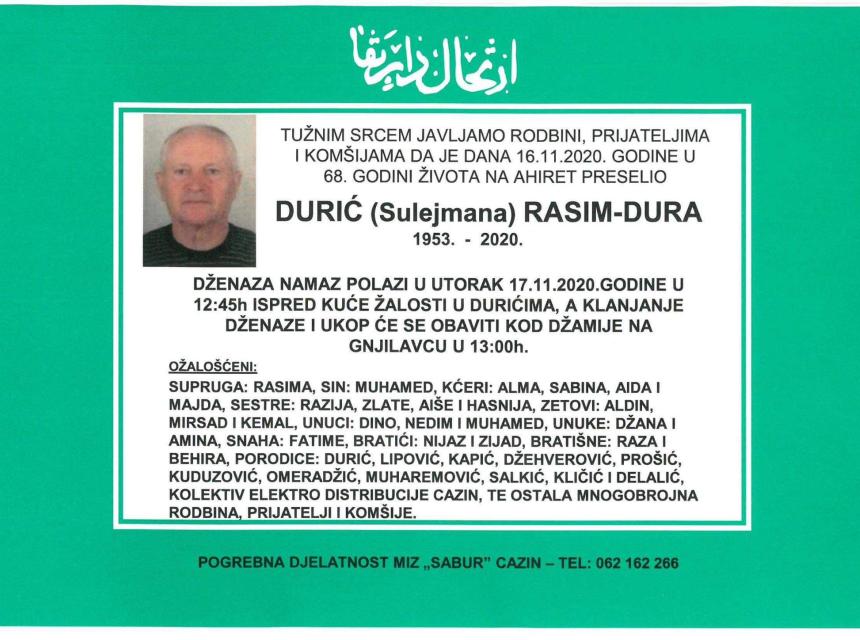 Tužnog srca i s bolom u duši obavještavamo rodbinu, komšije i prijatelje da je naš dragi Durić (Sulejmana) Rasim-Dura, dana 16.11.2020. godine, u 68-oj. godini života, preselio na Ahiret.
