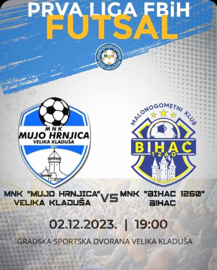 U Gradskoj sportskoj dvorani u Velikoj Kladuši MNK “Mujo Hrnjica” danas od 19:00h će odmjeriti snage s ekipom MNK “Bihać”. Radi se o utakmici 6. kola Futsal lige grupa Zapad.