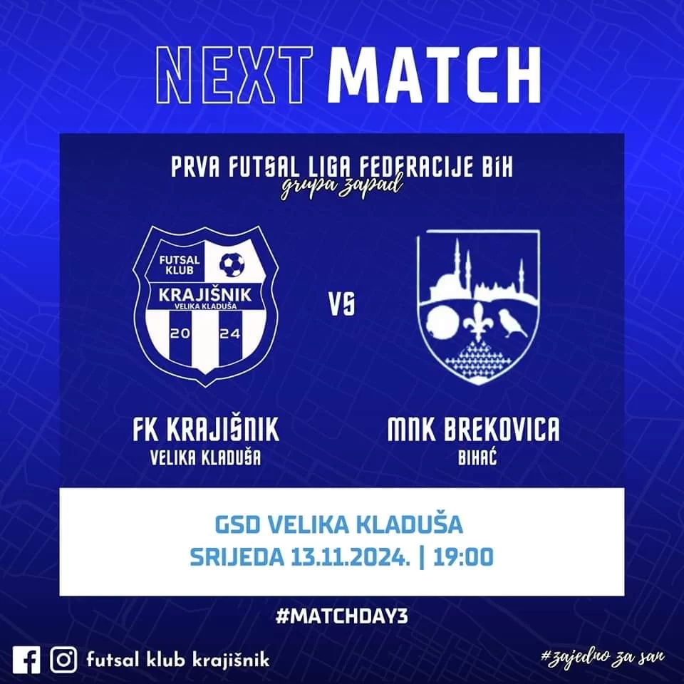 – Nakon podjele bodova u prvoj prvenstvenoj utakmici i slobodnog prethodnog kola, igrači Futsal kluba Krajišnik danas u Gradskoj sportskoj dvorani od 19:00h pred domaćim navijačima dočekuju MNK Brekovica 2023. Bit će ovo prva domaća utakmica novoosnovanog futsal kluba iz Velike Kladuše. Podržite ih svojim dolaskom.