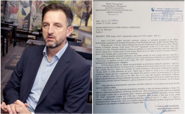 S tim u vezi u cilju iniciranja prekršajnog postupka, a zbog počinjenog prekršaja iz člana 152. Zakona o osnovama bezbjednosti saobraćaja na putevima u BiH potrebno je da nam dostavite kompletne lične podatke vozača koji je pomenutog dana i vremena upravljao putničkim motornim vozilom marke "WV Golf", kao i kompletne lične podatke o licu koje se kao putnik nalazilo u predmetnom vozilu, a zbog počinjenog prekršaja iz člana 8. Stav 2. i 5. Tačke a i f, Zakona o prekršajima protiv javnog reda i mira, jer prema raspoloživim podacima utvrđeno je da gospodine Dževad Mahmutović nije ministar za ljudska prava i izbjeglice- zaključuje se u dokumentu iz MUP-a KS upućenom državnom Ministarstvu za ljudska prava i izbjeglice.