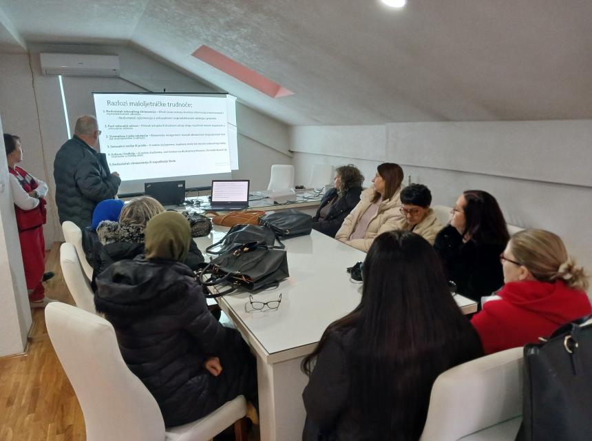 Jučer je u Domu zdravlja Velika Kladuša održano predavanje na temu "Maloljetnička trudnoća", namijenjeno aktivu nastavnika razredne nastave Osnovne škole "Podzvizd". Predavači su bili stručnjaci iz različitih oblasti: prof. dr. Sulejman Kendić, Samra dr. Alibegić, specijalista urgentne medicine, i Selma Sarajlija, psiholog, koji su detaljno obradili problem maloljetničke trudnoće, kako u našem društvu, tako i globalno, te ukazali na zabrinjavajuću pojavu povećane incidencije ovog problema.