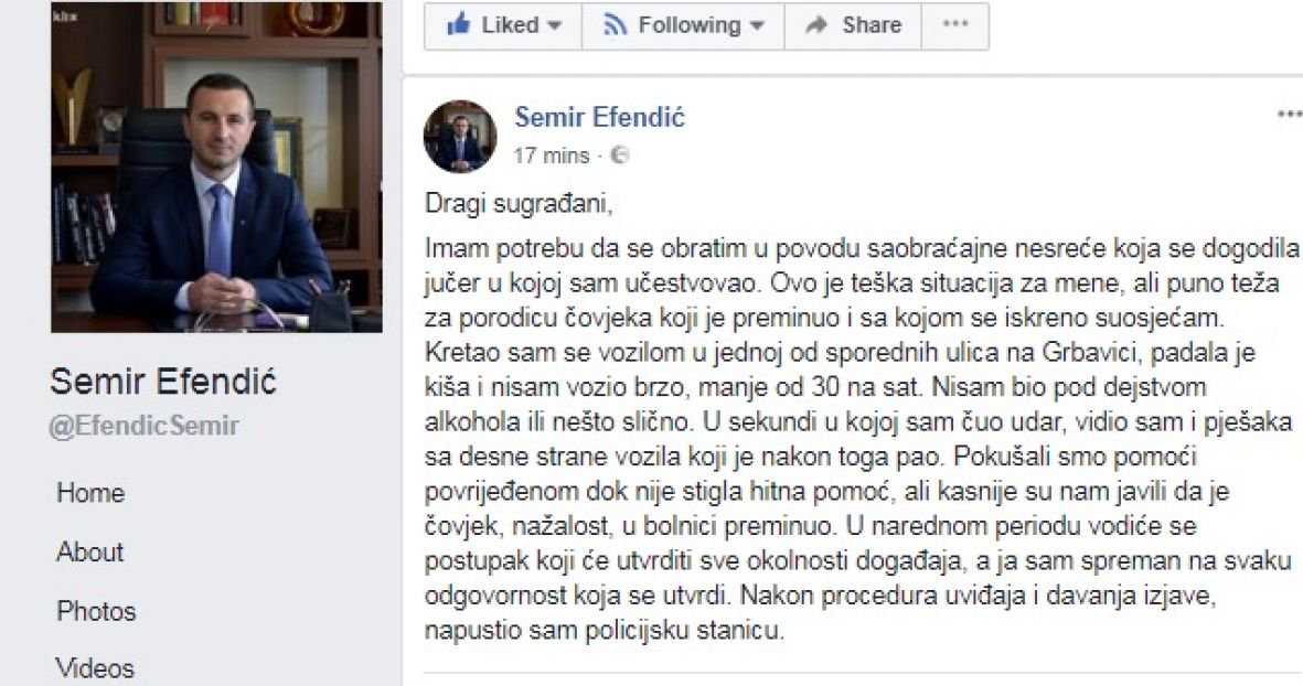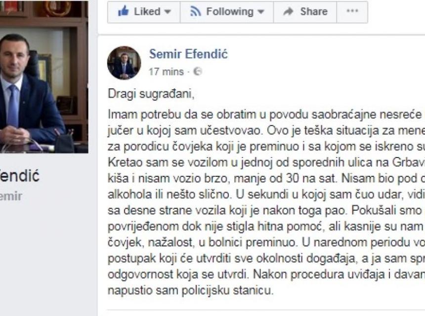 "Imam potrebu da se obratim u povodu saobraćajne nesreće koja se dogodila jučer u kojoj sam učestvovao. Ovo je teška situacija za mene, ali puno teža za porodicu čovjeka koji je preminuo i sa kojom se iskreno suosjećam. Kretao sam se vozilom u jednoj od sporednih ulica na Grbavici, padala je kiša i nisam vozio brzo, manje od 30 na sat. Nisam bio pod dejstvom alkohola ili nešto slično. U sekundi u kojoj sam čuo udar, vidio sam i pješaka sa desne strane vozila koji je nakon toga pao. Pokušali smo pomoći povrijeđenom dok nije stigla hitna pomoć, ali kasnije su nam javili da je čovjek, nažalost, u bolnici preminuo. U narednom periodu vodiće se postupak koji će utvrditi sve okolnosti događaja, a ja sam spreman na svaku odgovornost koja se utvrdi. Nakon procedura uviđaja i davanja izjave, napustio sam policijsku stanicu", naveo je Efendić.