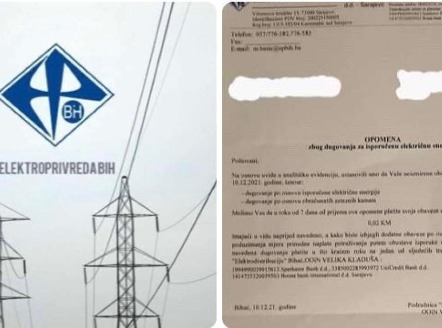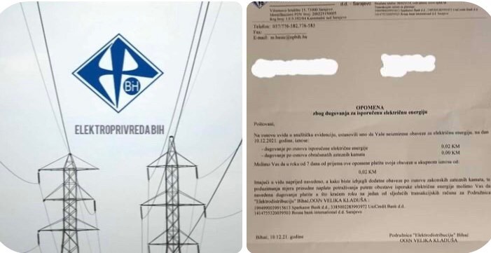 Posebno zanimljiv je predmet koji se ovih dana pojavio u Velikoj Kladuši, kada je jedan gradjanin dobio pismenu opomenu da vrati dug od 0.02 KM ili će u protivnom Elektrodistribucija biti primorana da pokrene prinudnu naplatu koja će značiti i dodatne zatezne kamate itd.