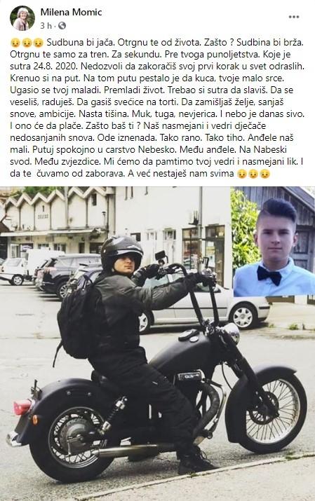 - Sudbina bi jača. Otrgnu te od života. Zašto? Sudbina bi brža. Otrgnu te samo za tren. Za sekundu. Prije tvoga punoljetstva. Koje je sutra 24.8.2020. Ne dozvoli da zakoračiš svoj prvi korak u svet odraslih. Krenuo si na put. Na tom putu pestalo je da kuca, tvoje malo srce. Ugasio se tvoj mladi, premladi život. Trebao si sutra da slaviš. Da se veseliš, raduješ. Da gasiš svjećice na torti. Da zamišljaš želje, sanjaš snove, ambicije. Nasta tišina. Muk, tuga, nevjerica. I nebo je danas sivo. I ono će da plače. Zašto baš ti? Naš nasmijani i vedri dječače nedosanjanih snova. Ode iznenada. Tako rano. Tako tiho. Anđele naš mali. Putuj spokojno u carstvo Nebesko. Među anđele. Na Nabeski svod. Među zvjezdice. Mi ćemo da pamtimo tvoj vedri i nasmijani osmijeh. I da te čuvamo od zaborava, glasi emotivna poruka objavljena na Facebooku.