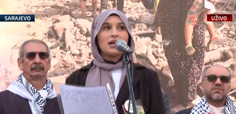 “Ali neće ih samo ubiti granata već i šutnja cijeloga svijeta. Zato što su palestinska djeca samo broj iz statistike poginulih. Zašto svijet ne priča da je šutnjom ubio buduće inžinjere, doktore, pisce i naučnike? Zašto se izraelskom agresoru dopušta da ubija one koji bi sutra spasili ovaj svijet”, kazala je djevojka Sara u svom obraćanju.